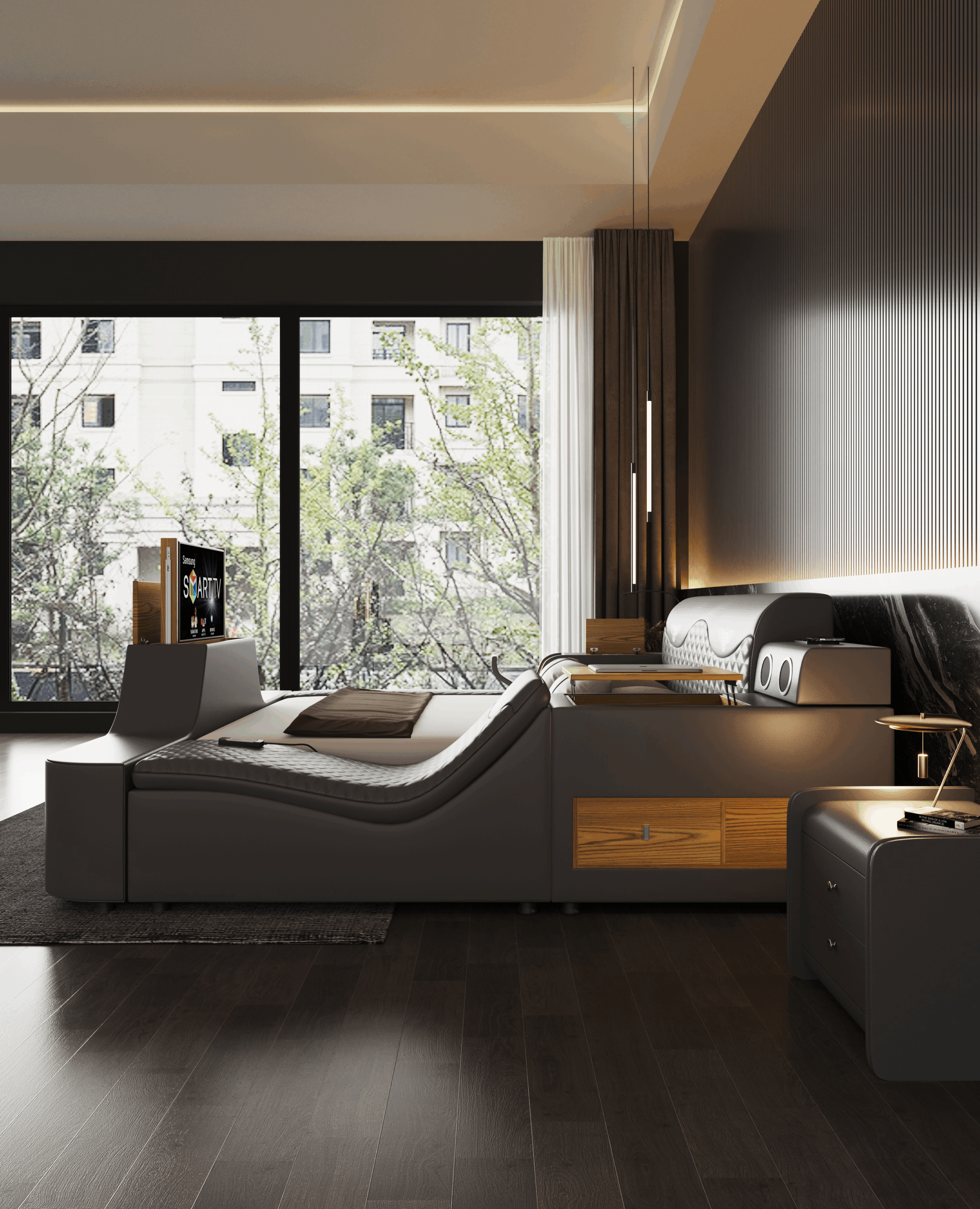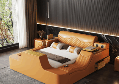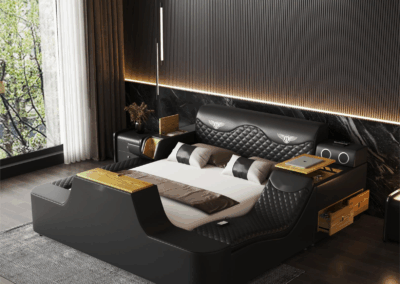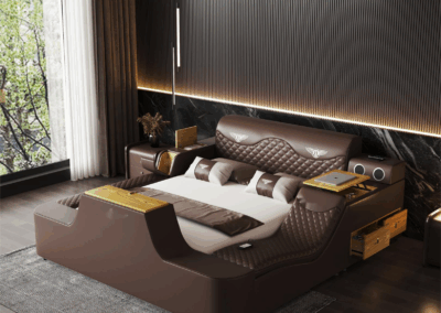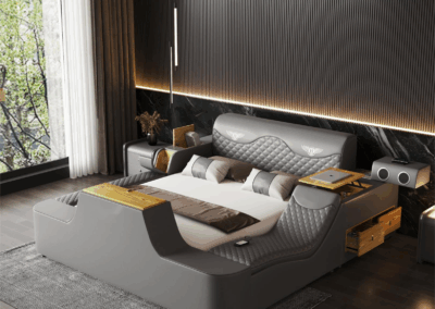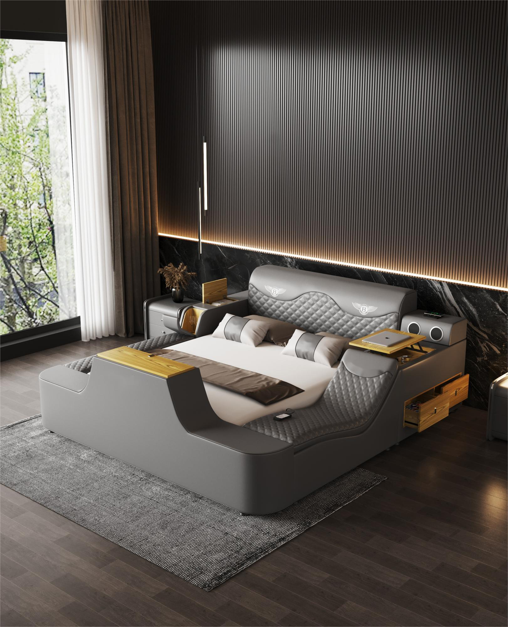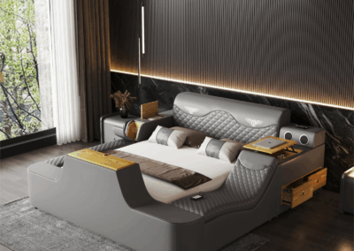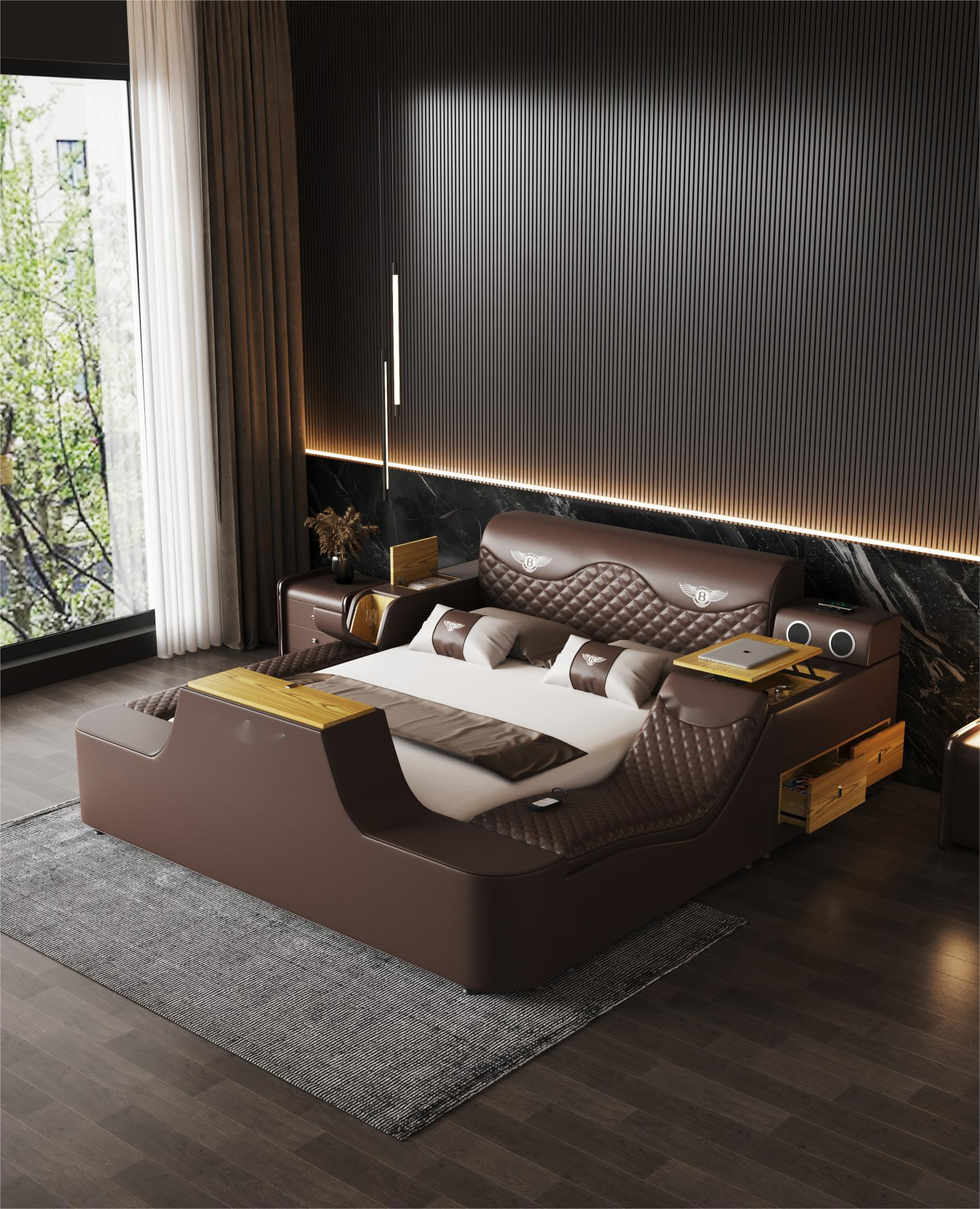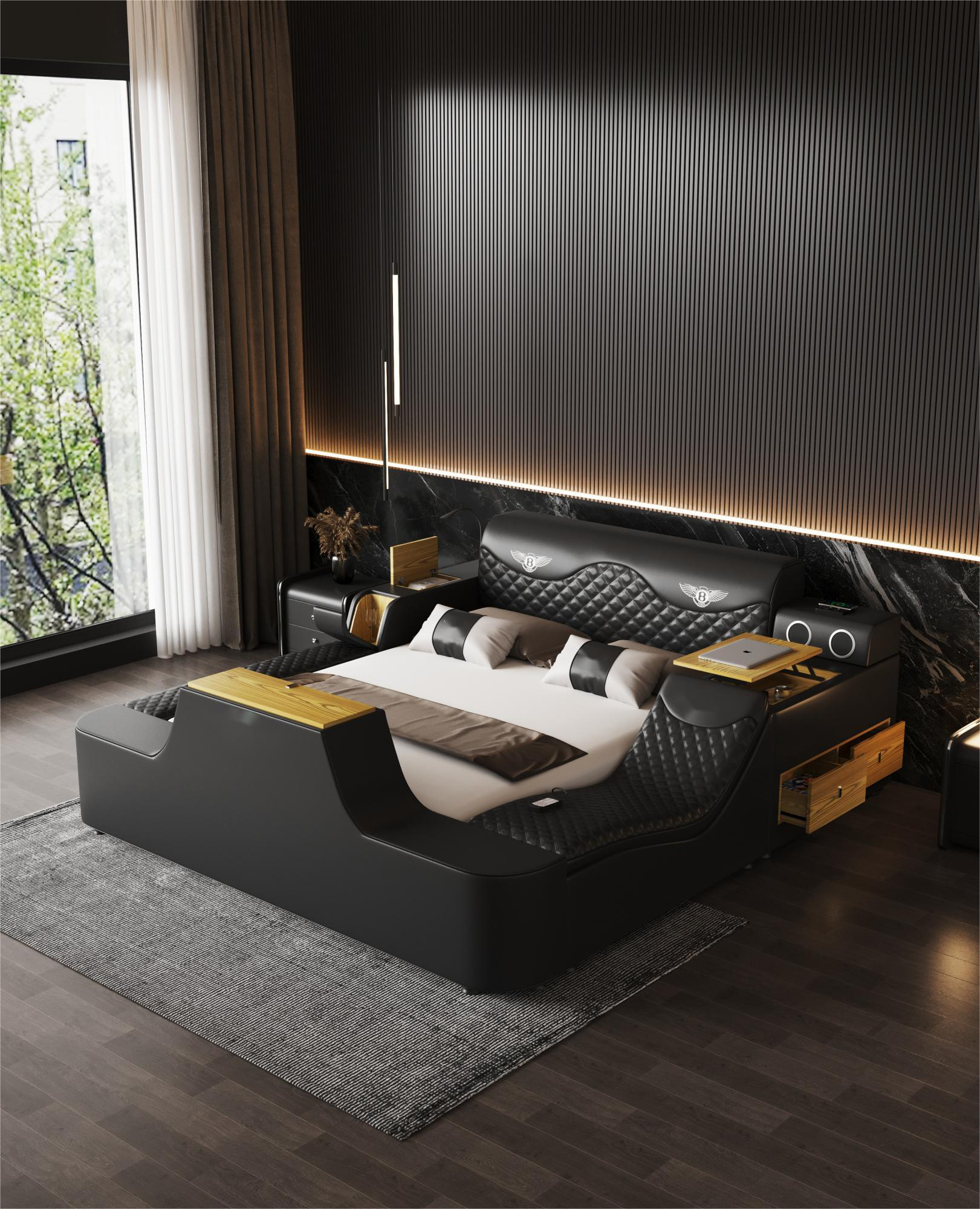 Designer, Bentley Multi-Functional TV Bed with the following features: 40 inch TV, Refrigerator, Cupholder, Massage Chair, Drawers, Computer Desk, Safety Box, Bluetooth Music System and a Wireless Cellphone Charger.