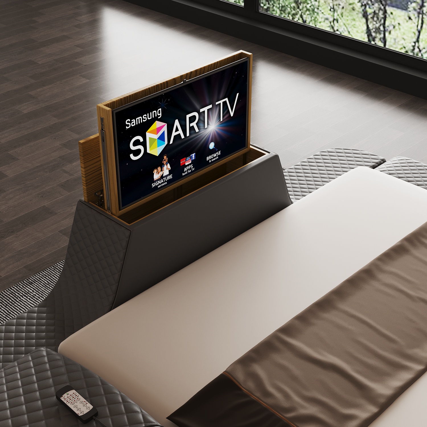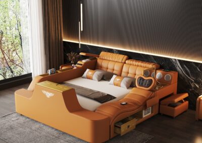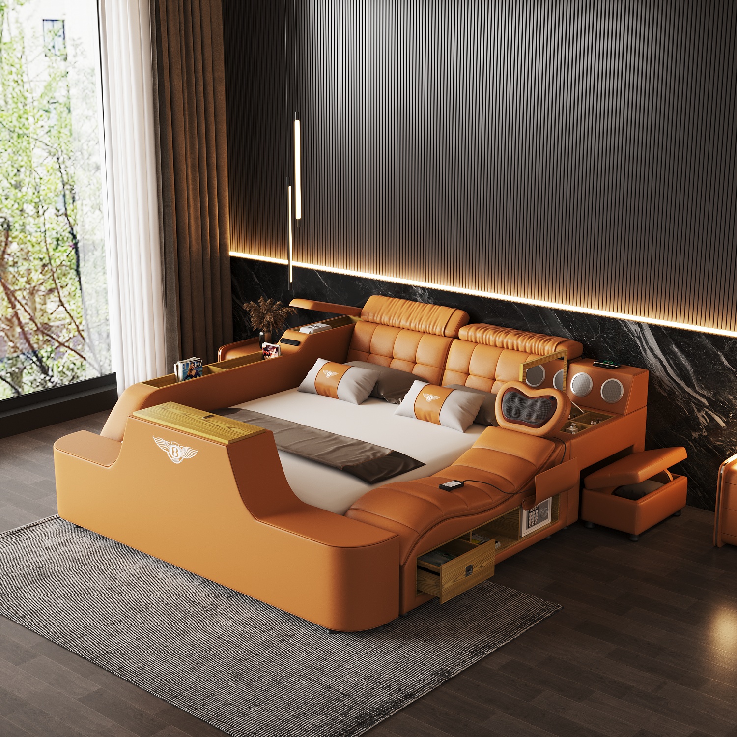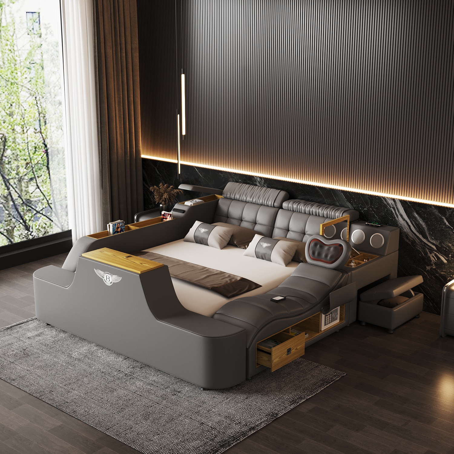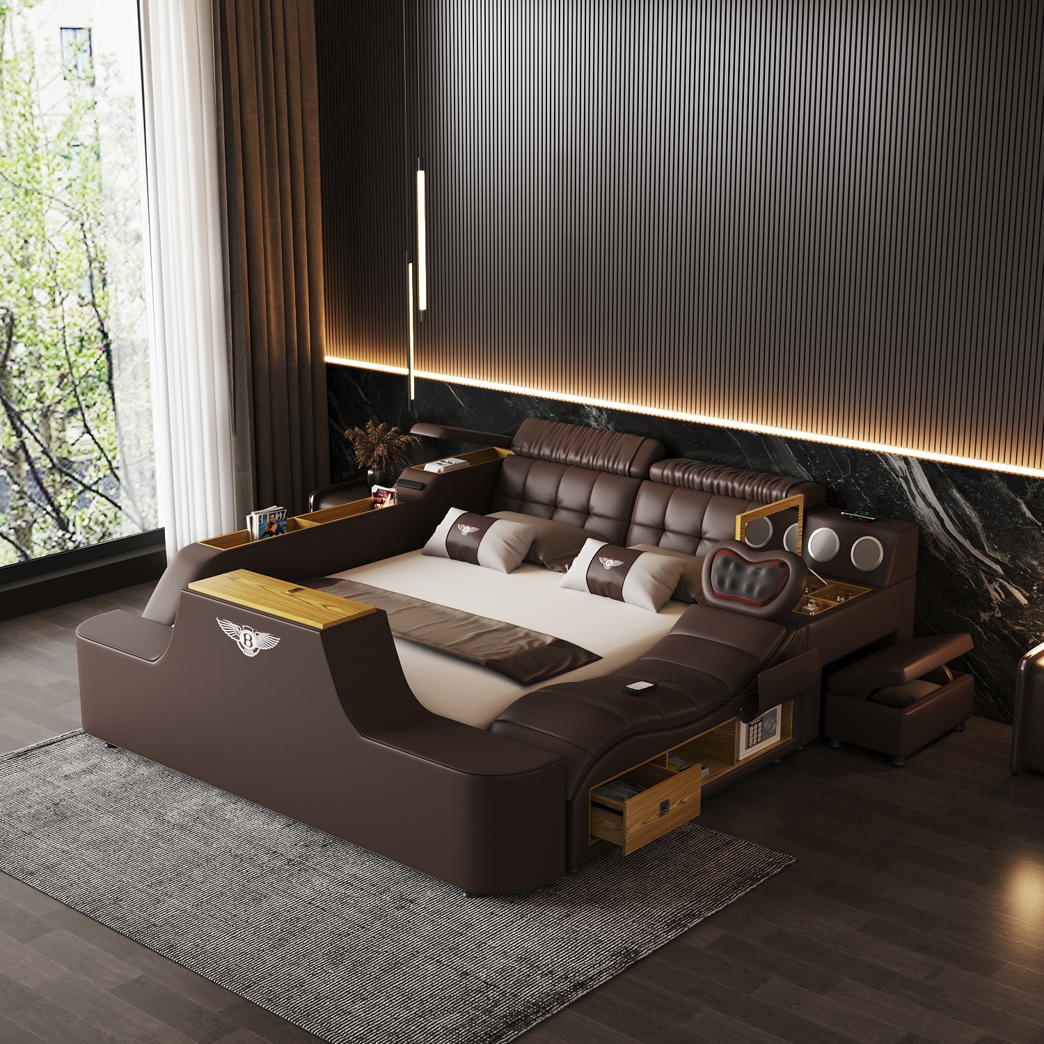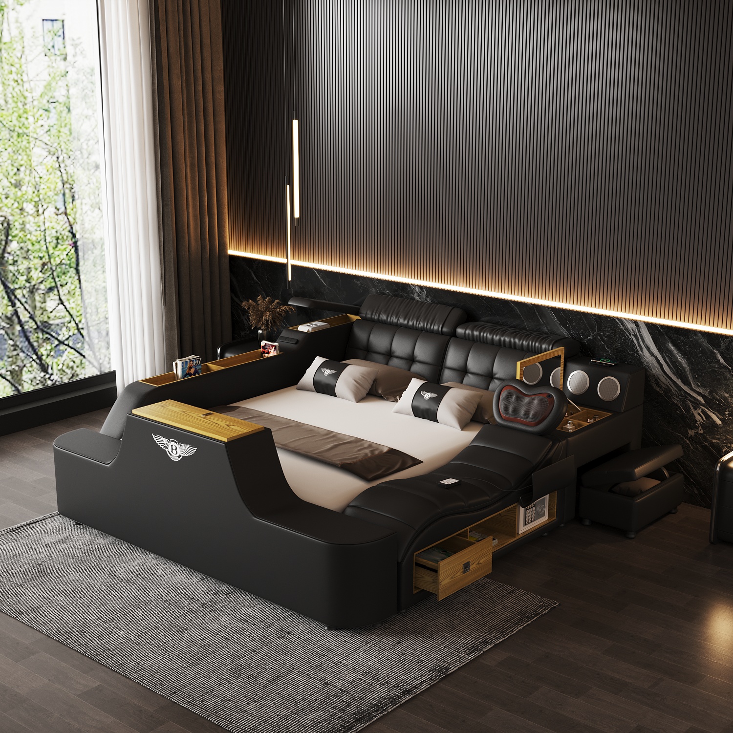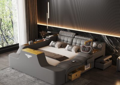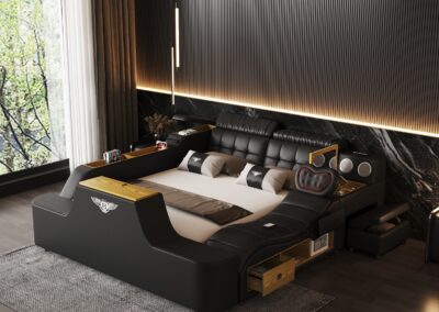 Designer, Bentley Multi-Functional TV Bed with the following features: 40 inch TV, Refrigerator, Functional Headrests, Power Socket, Massage Chair, Drawers, Dresser, Safety Box, Storage Bag, Bluetooth Music System and a Wireless Cellphone Charger.