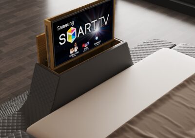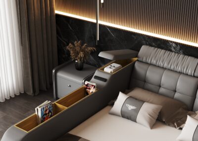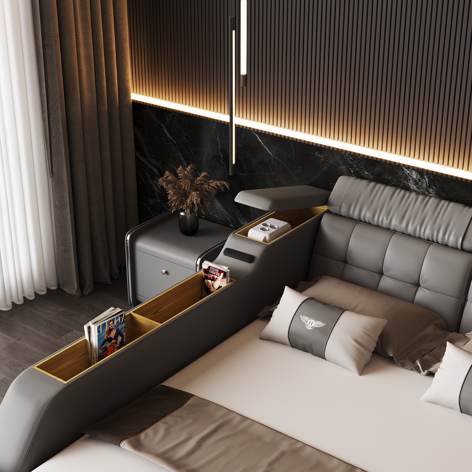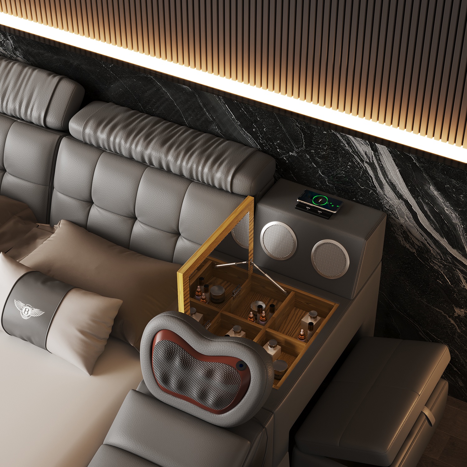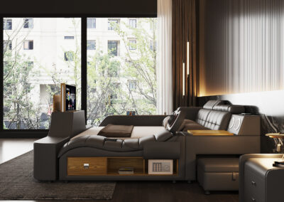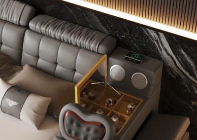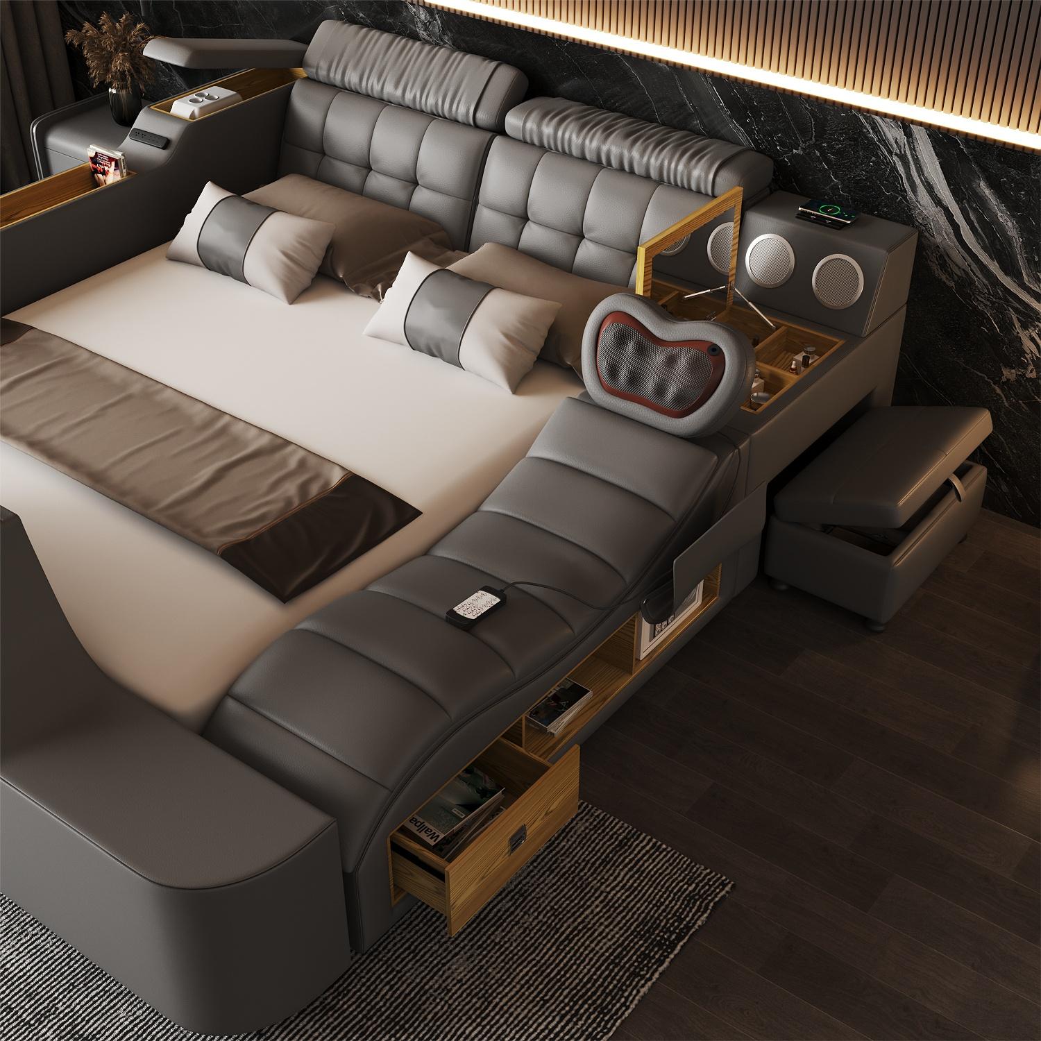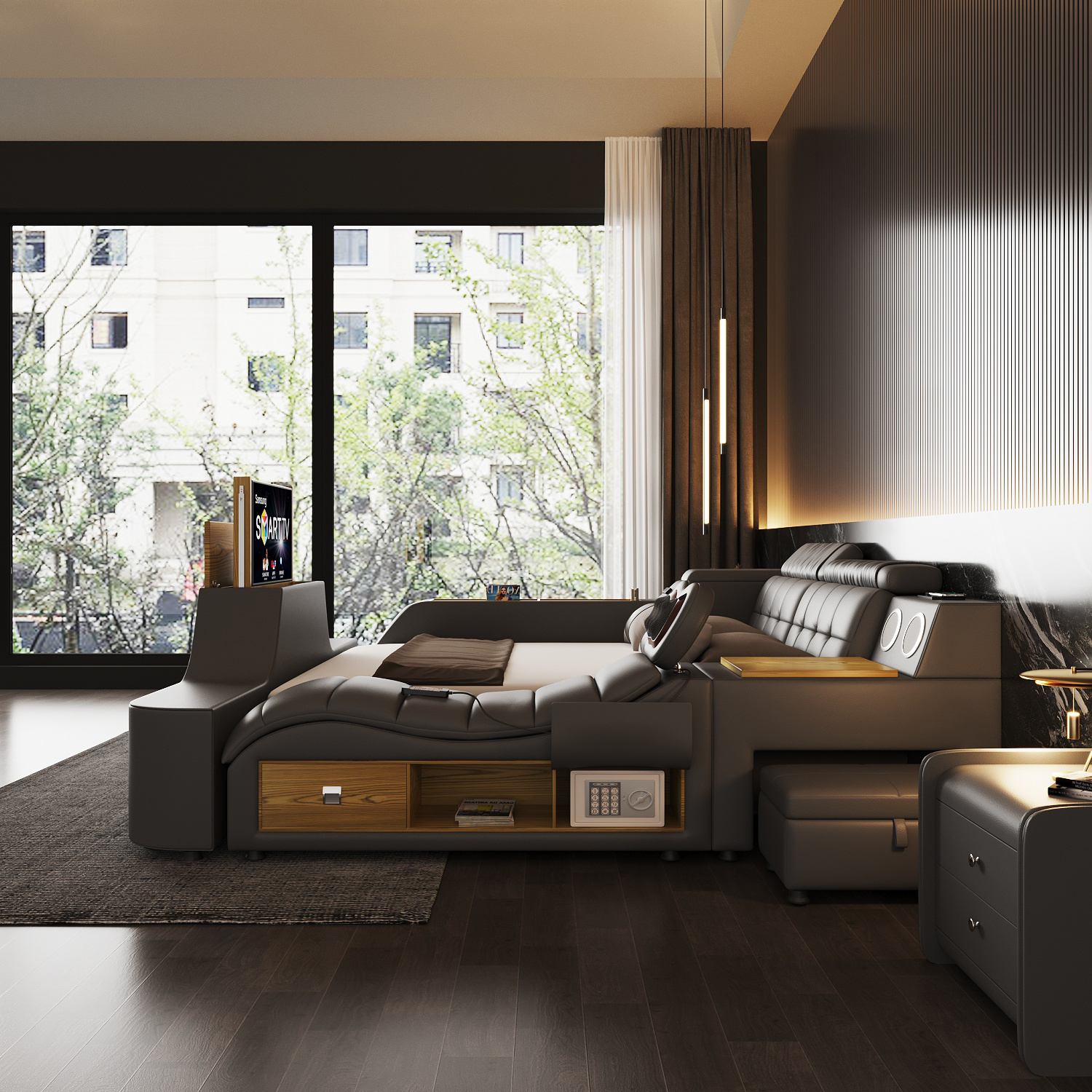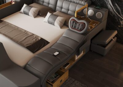 Designer, Bentley Multi-Functional TV Bed with the following features: 40 inch TV, Refrigerator, Functional Headrests, Power Socket, Massage Chair, Drawers, Dresser, Safety Box, Storage Bag, Bluetooth Music System and a Wireless Cellphone Charger.